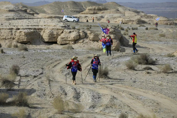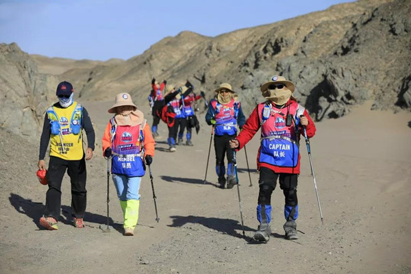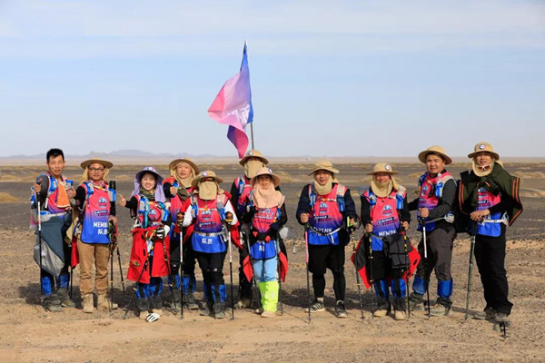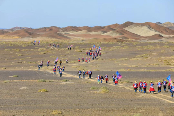 第一天是8小時25公里,牛商們在太陽還沒完全升起來就開始了遠征前的熱身,原力專業(yè)的教練,激昂的樂章,鼓舞著雄心勃勃的牛商們,一聲號令全體出發(fā),萬馬奔騰的節(jié)奏開始了,彩旗飄飄,紅裝戰(zhàn)衣,藍色背包,熒光粉的名號牌,浩浩蕩蕩,塵土飛揚!戈壁我們來了!
