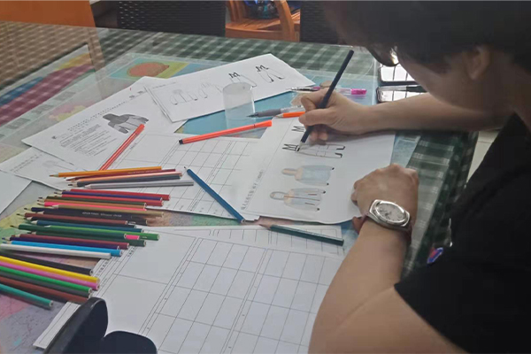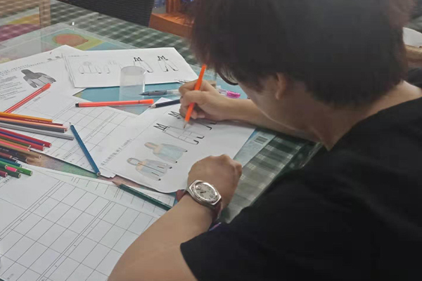 盡管困難重重,我們也要想進一切辦法做到,不僅要做好,而且要做到最好!我們的總經(jīng)理自己也搖身一變設(shè)計師——畫稿,可以看到以下的圖片,認真、負責(zé)的態(tài)度,用心的為客戶所思,一筆一筆的畫好,一點點的涂好顏色;還有一個紙樣哥哥也在幫忙畫,他們兩個人在一兩天的時間內(nèi)要畫好接近10個款衣服和褲子,雖然我們的時間不多,但是睿牛的小伙伴們也是很努力的去做,努力過就不曾后悔。