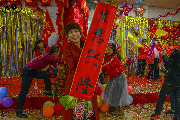 獅子在“獅子郎”的引導下,表演騰翻、撲跌、跳躍、登高、朝拜等技巧;最最主要的高潮采青,獅子獵取懸掛于高處的“利是”(以生菜為多),圖片中展示了獅子將獵取的“利是”扔向華姐的手中,以及“生意興隆”對聯,愿2020年紅紅火火、生意興隆、事事平安;